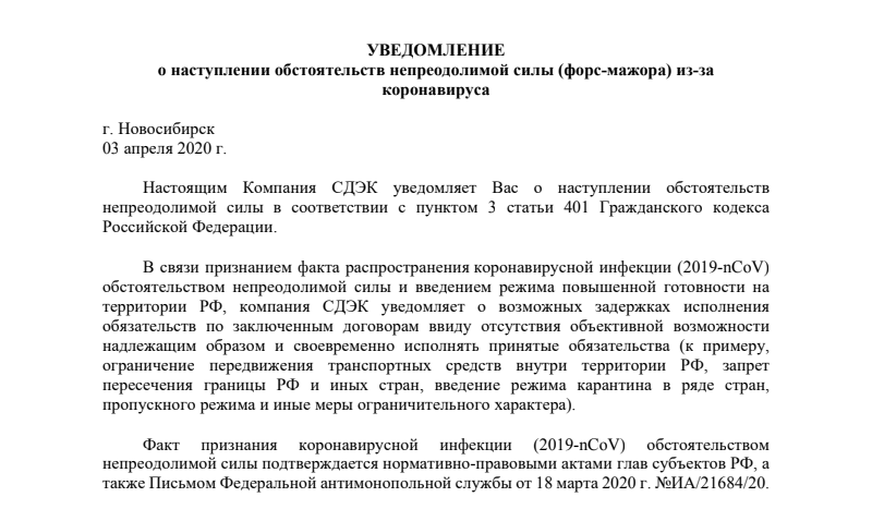 По всему миру ввели режим повышенной безопасности, но СДЭК продолжает полноценную работу. Текущая ситуация приравнивается к обстоятельствам непреодолимой силы в соответствии с пунктом 3 статьи 401 Гражданского кодекса Российской Федерации. Ограничительные меры касаются и службы доставки: в целях безопасности сокращаются наземные и авиарейсы как внутри страны, так и за рубеж.
