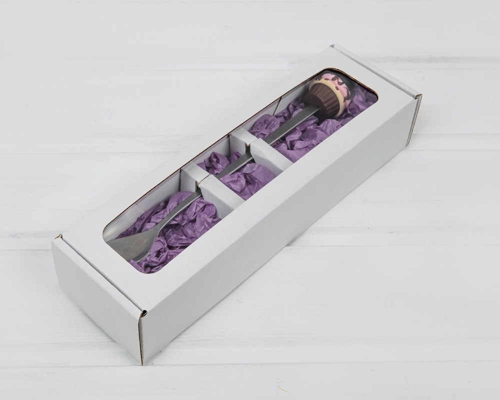 Коробка предназначена для упаковки вкусной ложки, а без вкладыша подходит для небольших плоских изделий. Наличие прозрачной крышки позволяет увидеть содержимое коробки.