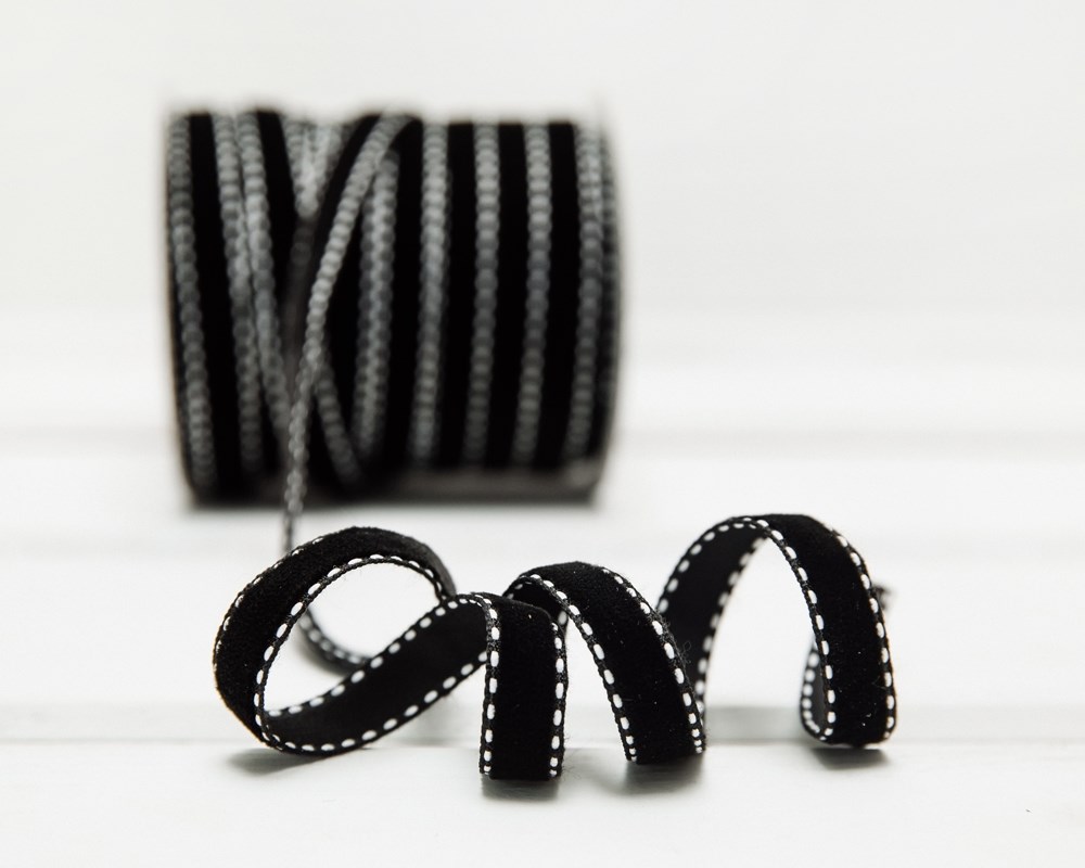 Лента бархатная с отстрочкой, 10 мм, черная, 1 м