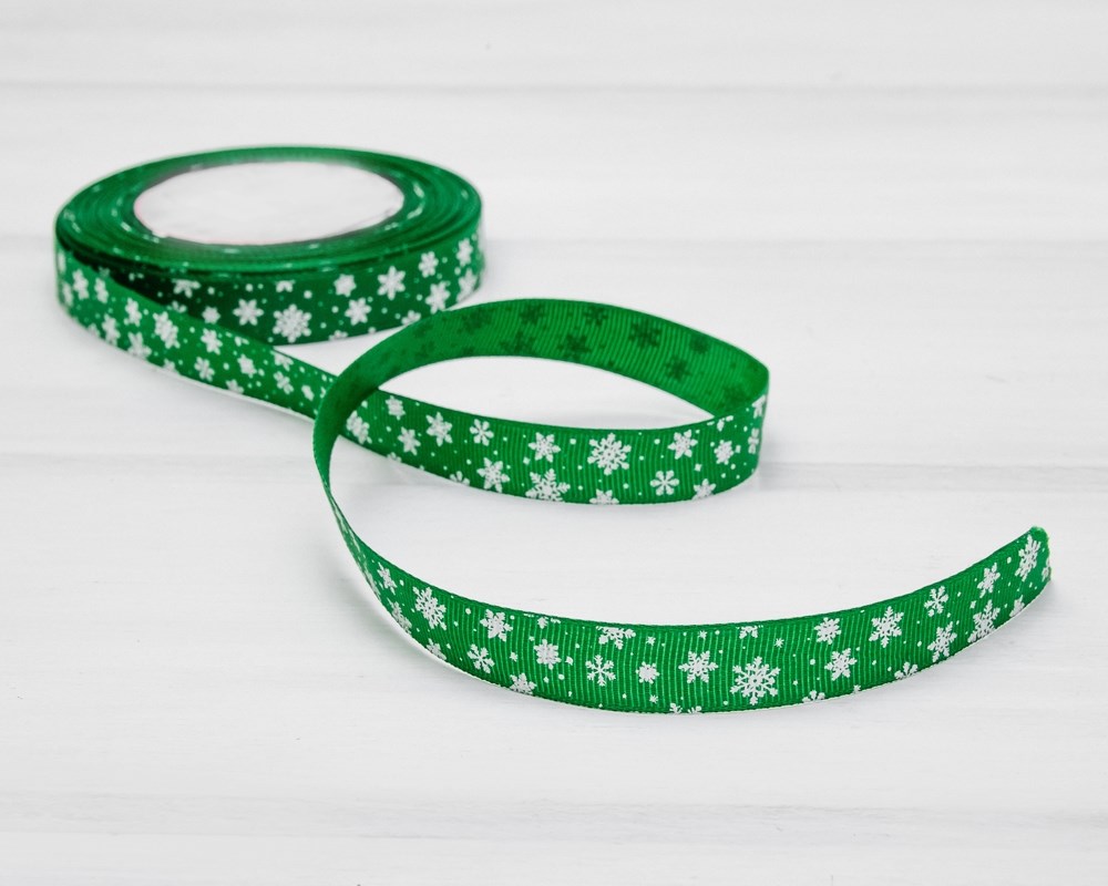 Лента репсовая, 15 мм, Снежинки, зелёная, 22 м