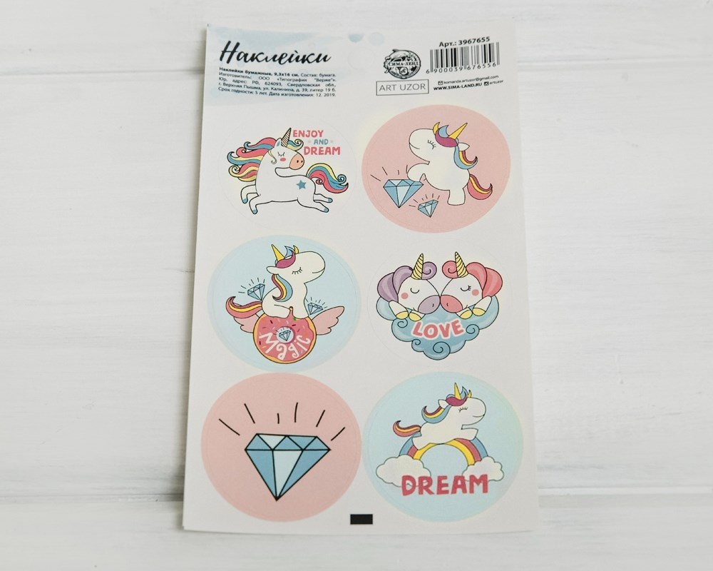 Наклейки, единорожка, круглые, d=4 см, лист 6 шт.