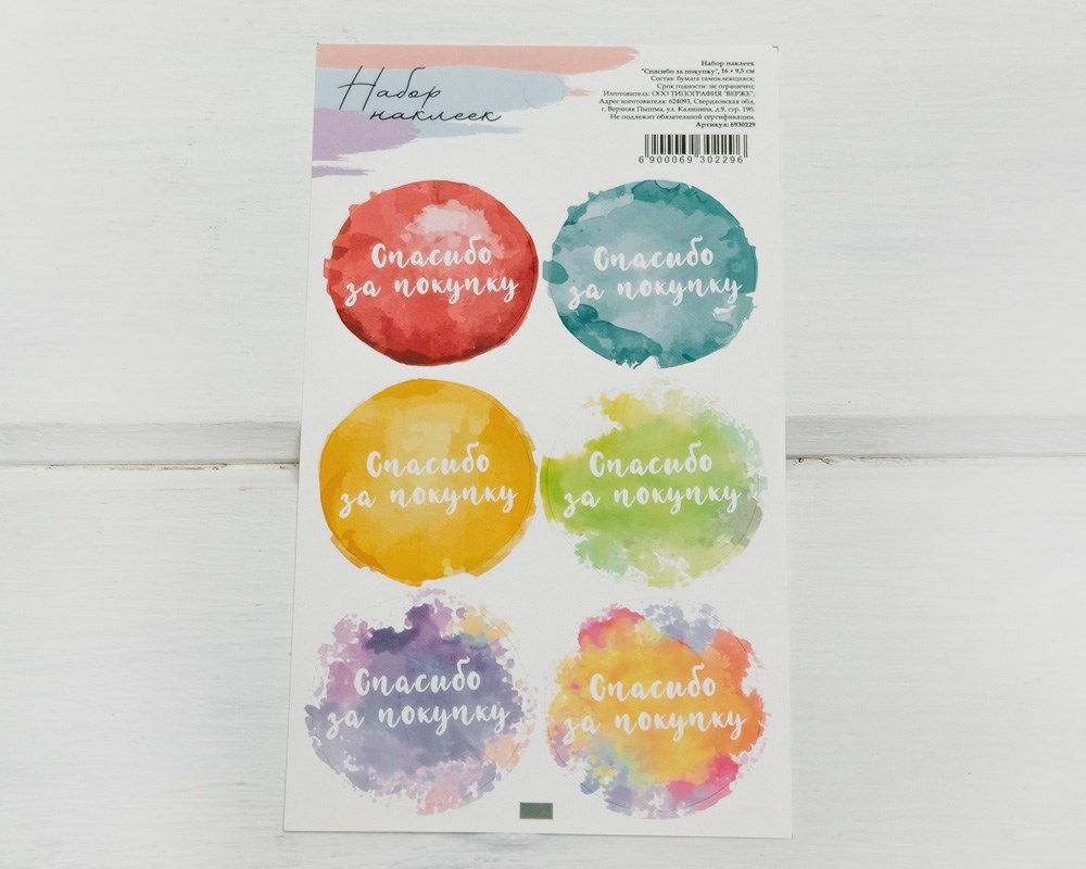 Наклейки «Спасибо за покупку», разноцветные , круглые, d=4 см, лист 6 шт.