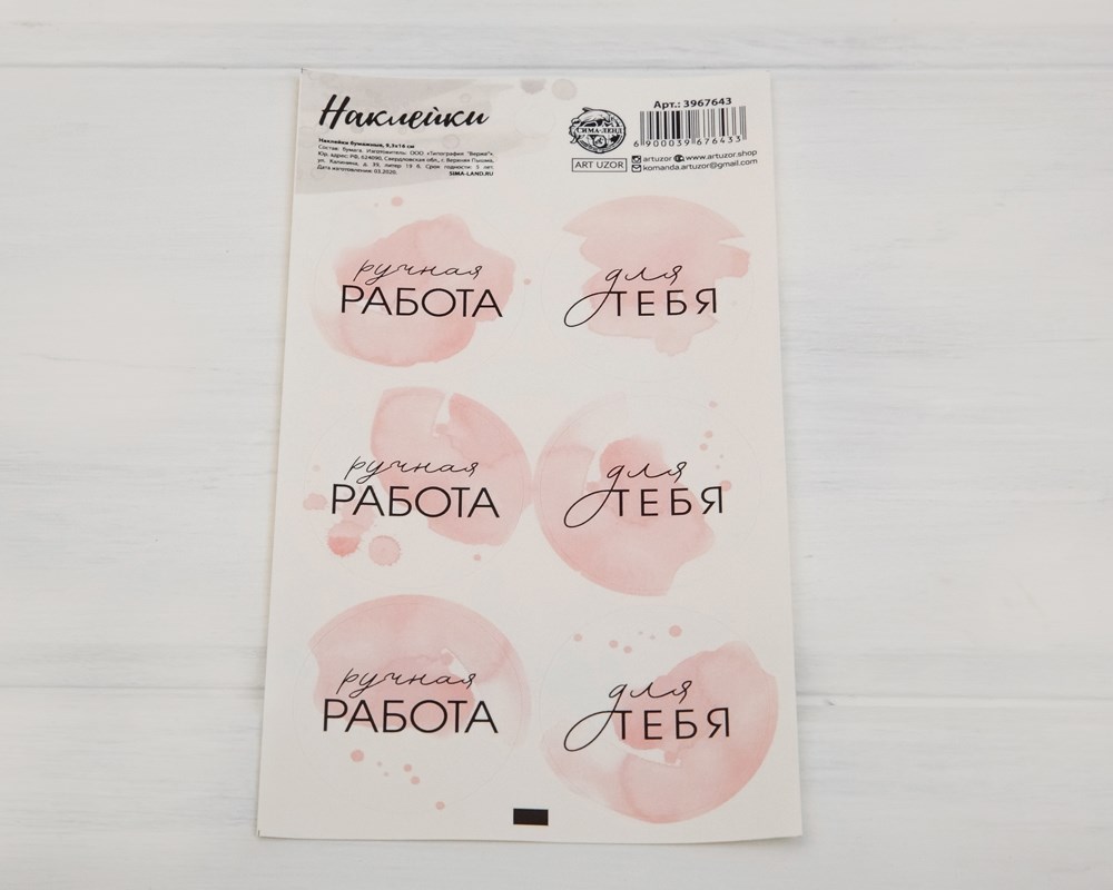 Наклейки «Ручная работа» в розовом, круглые, d=4 см, лист 6 шт.